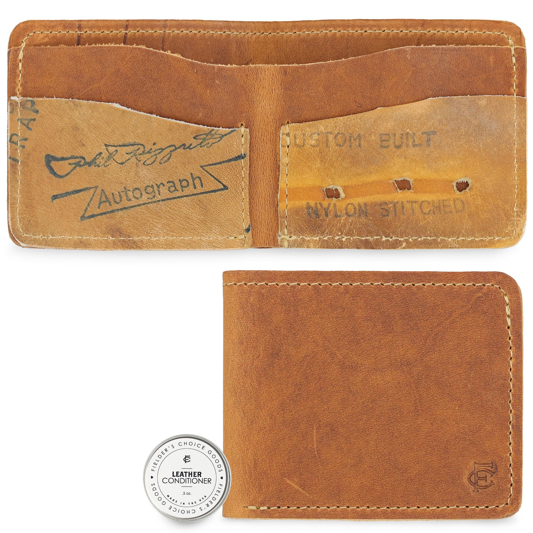 The two front card pockets on this billfold were hand-cut from a vintage baseball glove chosen explicitly for its visual character. We combined those pieces with a back panel and a middle layer of premium quality full-grain steerhide to provide structure and durability.