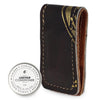 This sleek black money clip is crafted from glove leather with a smooth, refined finish and minimal gold markings that offer just a hint of its heritage. Understated and timeless, it blends modern simplicity with the quiet character of well-worn leather.